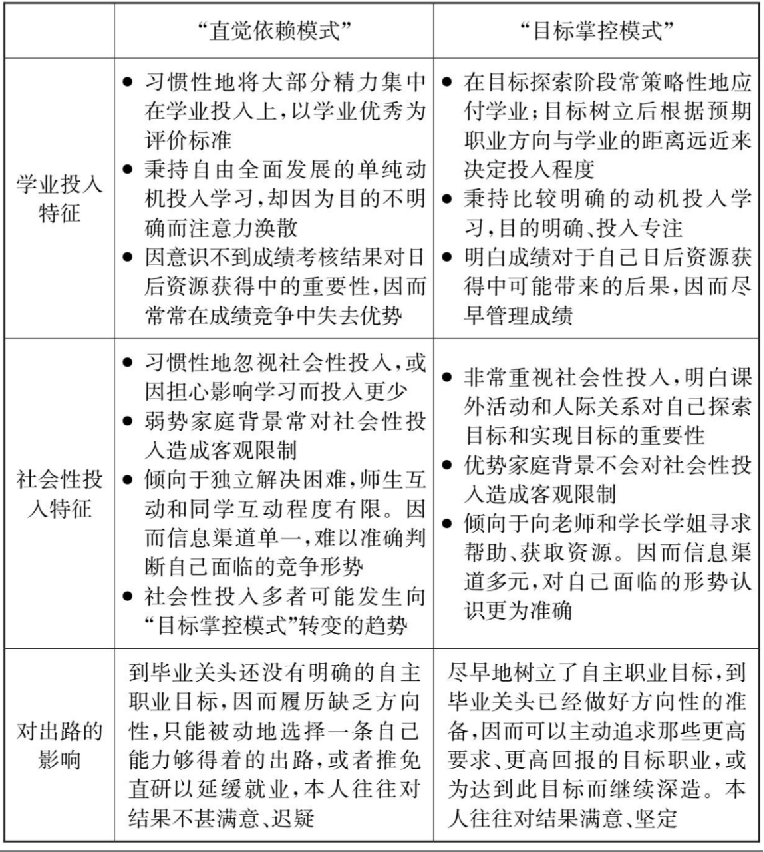 郑雅军老师在研究生阶段就做了这样一个研究,根据家庭背景把学生分成了两种模式,一个叫做直觉依赖模式,一个是目标掌控模式。简单来说呢,那些像是出身农村,父母不是大学说或者说家境一般的学生,比如偏远地区家庭的孩子,他更容易是以直觉依赖模式来度过大学,就如下图所示的两种模式。